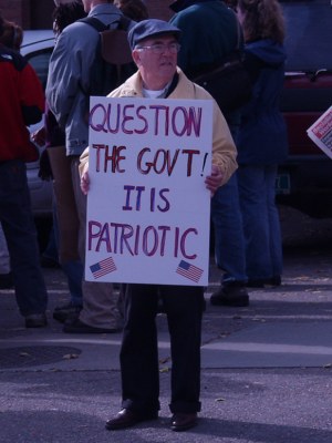 Activist stands by road displaying sign to passing motorists. The sign reads: "Question the Government. It is Patriotic."