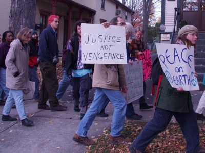 Signs say: "Justice not Vengeance" and "Peace on Earth"