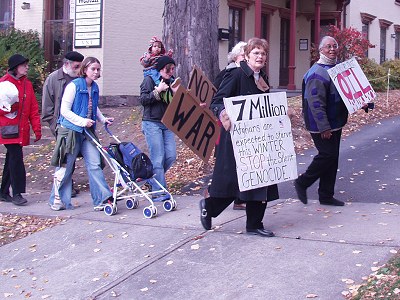 Marchers on Main Street sidewalk. Sign reads: Seven million Afghans are expected to starve this winter. Stop the genocide.