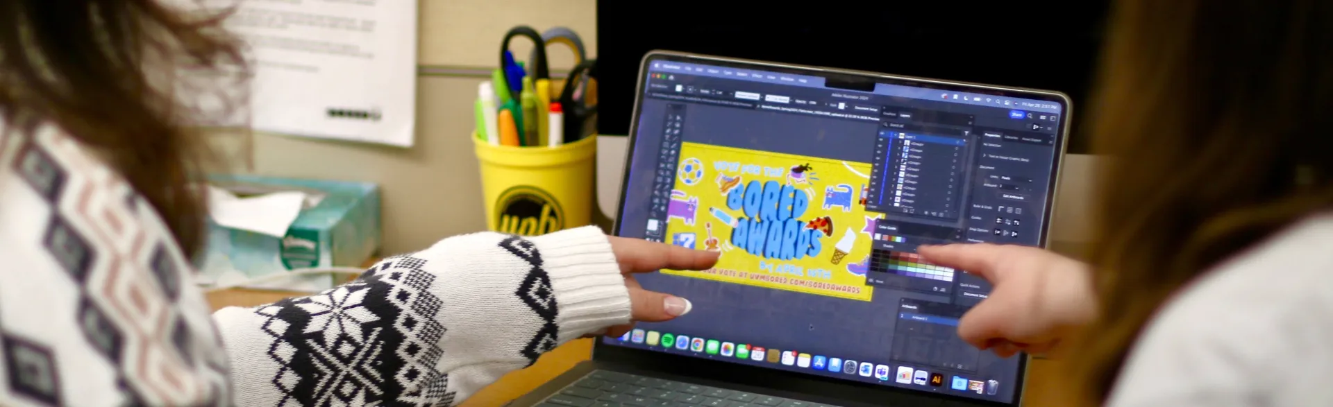 Our graphic designers primarily use the Adobe Creative Suite, with a strong emphasis on Illustrator to realize marketing projects. Students work on a mix of Student Life owned computers and their personal devices and have access to additional technology (iPads, Cameras, Tablets, etc) as needed.