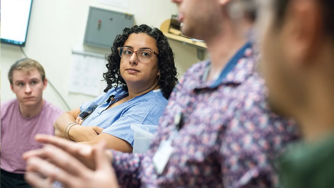 Roz King ’14, MSN’19, director of research in the UVM Department of Emergency Medicine, listens to members of the STAR team discuss the plan for contacting a patient about treatment. Photo by Andy Duback