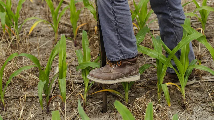 Joshua Faulkner squats in a corn field, scooping out the insides of a hole. He holds a handful of dark grey soil and squeezes it like a sponge. Beside him, a row of yellowed winter rye shakes in the wind.