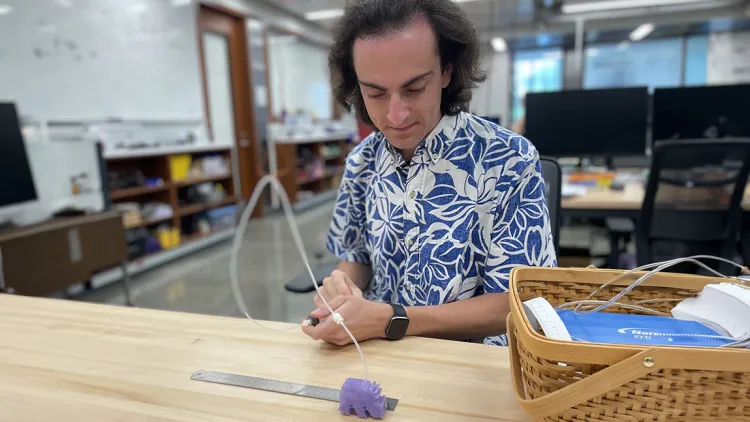 David Matthews tests a prototype of a robot entirely designed by artificial intelligence. It walks. Matthews graduated from UVM in 2021 and is now a research scientist at Northwestern University—in the lab of assistant professor Sam Kriegman who completed his masters and PhD at UVM with professor Josh Bongard. The three of them, with two other colleagues, teamed up on new research published in the Proceedings of the National Academy of Sciences. (Photo courtesy: Sam Kreigman, Northwestern)