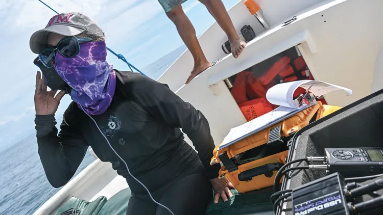 To hear and record the whales (and dolphins too) is a primary reason May-Collado stands in the center of this boat, transformed from petite 52-year-old assistant professor into some kind of ocean-going superhero, her bookish spectacles hidden behind bug-like sunglasses, a purple facemask over her nose and ears to fend off the fierce sun, an all-black lycra Aqua Lung suit—and a baseball hat with UVM in pink letters.