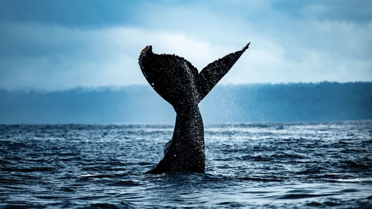 The two tail flukes of a humpback are an iconic symbol of whale-hood. The animal uses them to plunge deep in search of food or to smack the surface of the water—another form of communication. Each humpback has a unique pattern on its flukes that lets marine biologists identify individuals—and where they have traveled—through photographs shared on a global database. Photo: Joshua Brown.