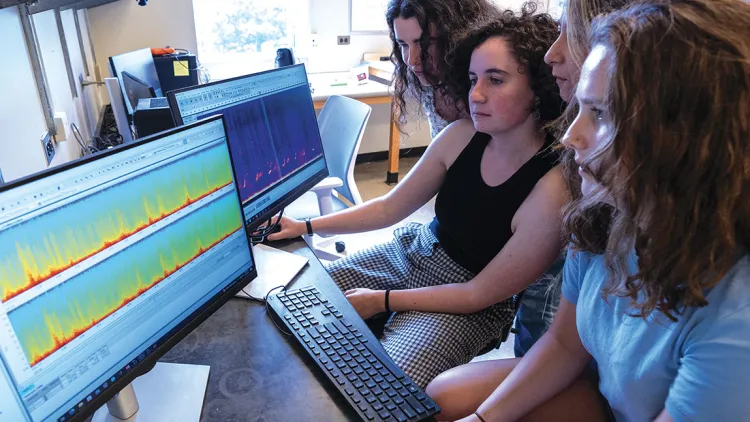 On a sultry Friday afternoon in September, on the second floor of Marsh Life Science, Franny Oppenheimer and Megan O’Connor—both UVM class of 2024 and in an accelerated master’s program—as well as fourth-year Ph.D. student Maia Austin, sit at silent computers watching sounds scroll across the screen. Oppenheimer explains that what I’m looking at is a spectrogram. “It’s basically a picture of sound,” she tells me, pointing at a double panel of orange and yellow lines spiking upward. “This is how we visualize the whale songs.”