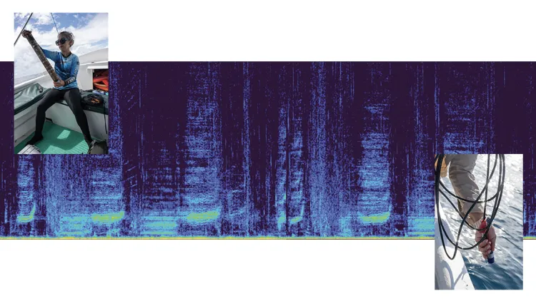 Left: After months on the floor of a coral reef at Caño Island, Costa Rica, a sound trap brought to the surface is examined by Prof. Laura May-Collado. What’s recorded inside will yield sonograms like the one shown here, and—the UVM scientist hopes—more secrets about the communication of dolphins, fish, and whales; Right: A hydrophone comes out of the sea. Like a microphone in the air, these ceramic devices produce a small electrical current when underwater pressure changes—letting scientists record whales singing far off, even miles out of sight. Photos by Joshua Brown.