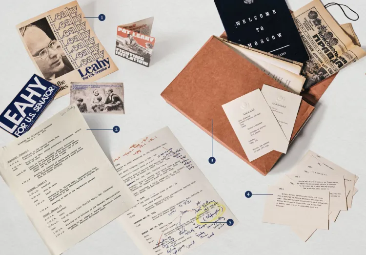 - During his first year in office, Senator Leahy took part in a Congressional Delegation (CODEL) visit to what was then the Soviet Union. This ephemera from that trip includes a luncheon card, embassy packet, and Russian newspapers that feature official state coverage of the delegation.