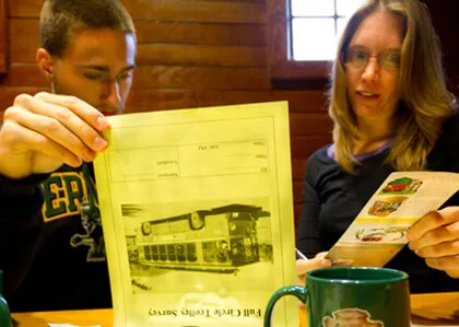 Kai Parker, UVM class of 2013, stands in the rain outside Woodstock, Vt. He’s waiting for a shuttle bus with Laura Anderson, a post-doctoral researcher. They want to ask riders what they think of the “cow-powered” electric trolley that ferries people from the village out to Marsh-Billings-Rockefeller National Historic Park: Is it useful? Why are you riding today?