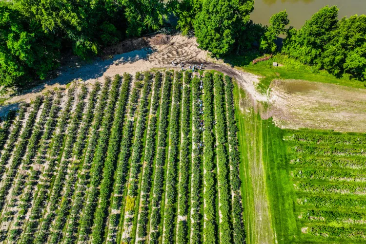 UVM researchers and administrators visit the Mazza farm in Essex on July 24, 2023. Drone imaging and analysis post-flooding gives farmers and disaster relief officials crucial information about crop damage and the health of surviving crops.