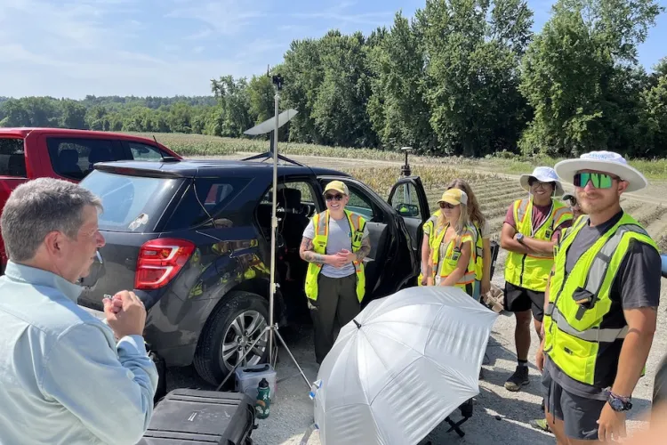 Vermont Secretary of Agriculture, Food and Markets Anson Tebbets speaks with the UVM UAS Team in the field.