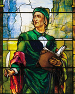 John Dewey Lounge, Old Mill. The Tiffany-designed memorial at the center of the west wall honors Professor Joseph Torrey. Installed in 1917, the Torrey window depicts Italian poet Dante Alighieri. |