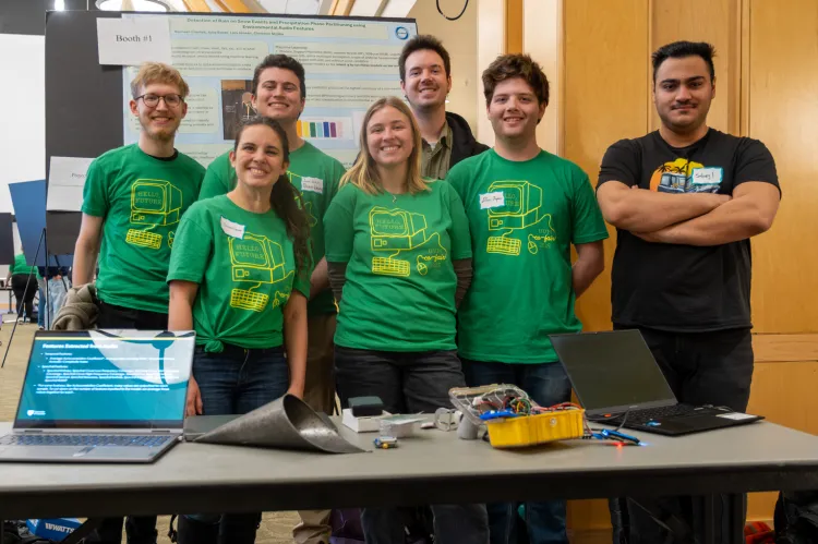 At the UVM Computer Science (CS) Fair, the CIROH student team earned first place in the Machine Learning / Research category for their project, Low-Cost Precipitation Phase Partitioning Using Acoustic Data and Machine Learning in the Edge. This project focuses on detecting rain on snow events and precipitation phase partitioning. The team consists of Rachael Chertok (MS), Julia Sober (URA), Soheyl Faghir-Hagh (PhD), Jordan Bourdeau (URA), Scott Barrett (MS), Drew Jepsen (MS), Casey Forey (MS). The students are advised by Christian Skalka, Chair of the Department of Computer Science, with Tia Xia, a professor in the Department of Electrical and Biomedical Engineering, co-advising Faghir-Hagh.