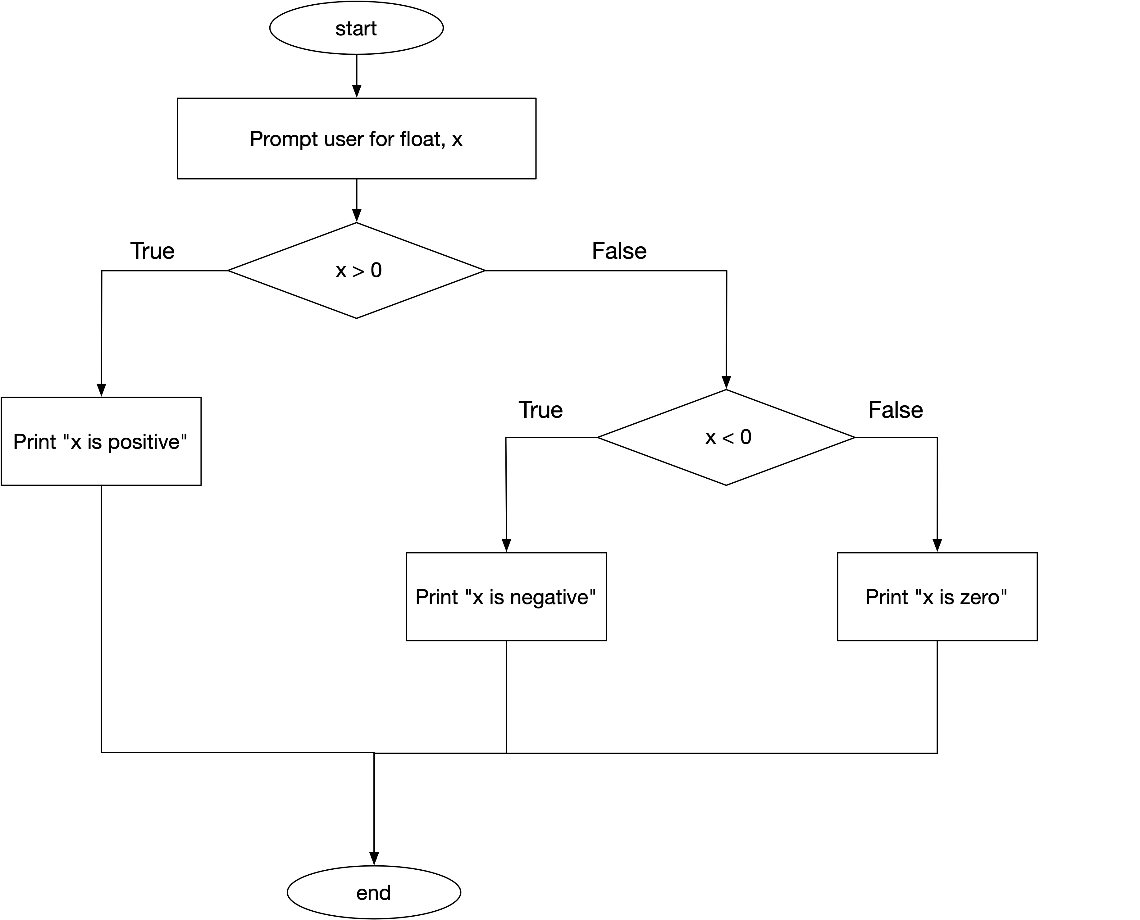print('x is zero!')Both programs—the one with the nested if and the one with elif—correctly implement the program described by our flow chart. In some cases, the choice is largely a matter of taste. In other cases, we may have reason to prefer one or the other. All things being equal (in terms of behavior), I think the elif solution presented here is the more elegant of the two.
