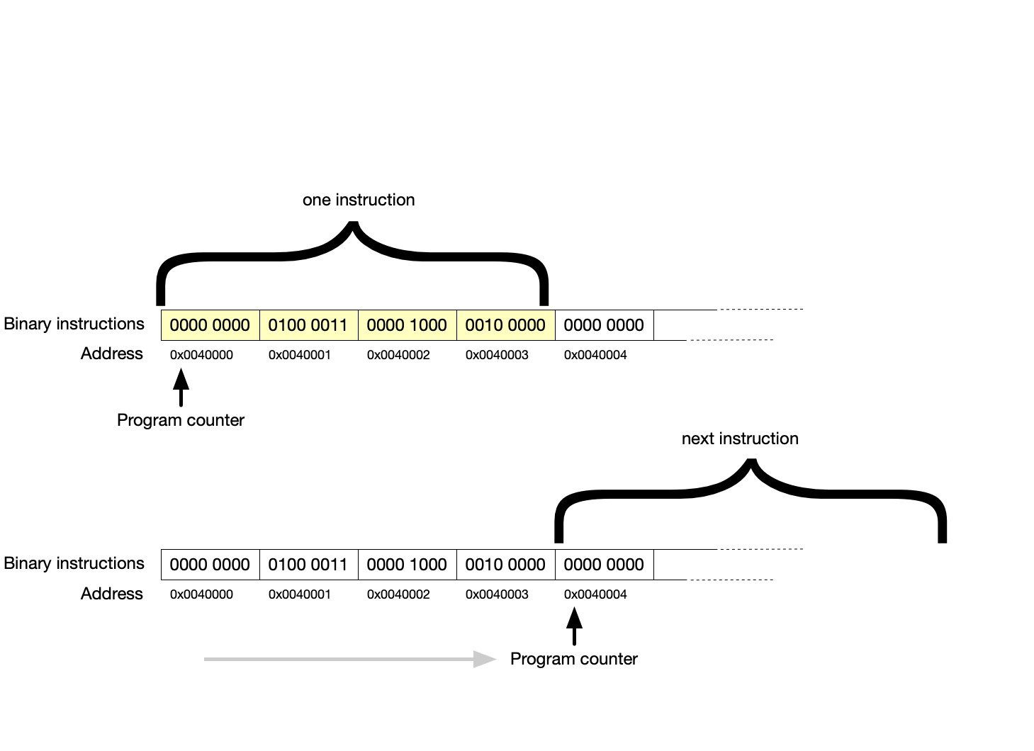 Looking at the illustration in the previous example, we see the instruction at the memory location indicated by the program counter is 0000 0000 0100 0011 0000 1000 0010 0000