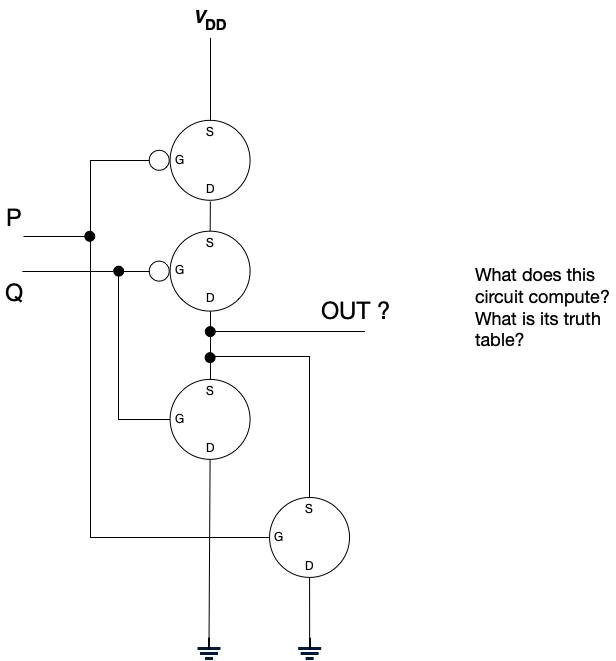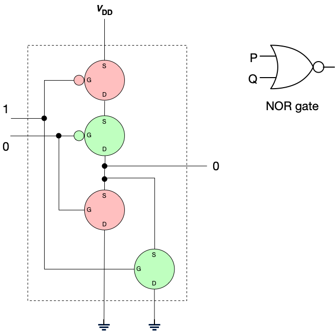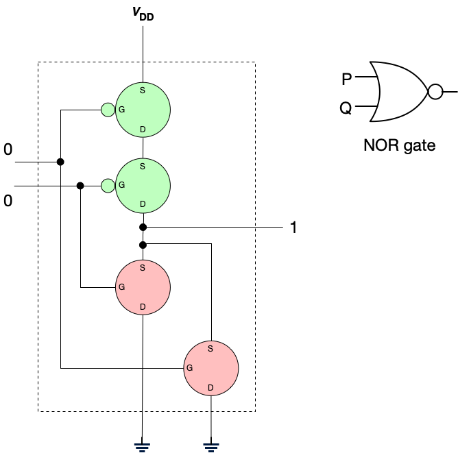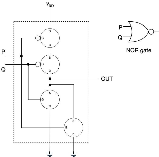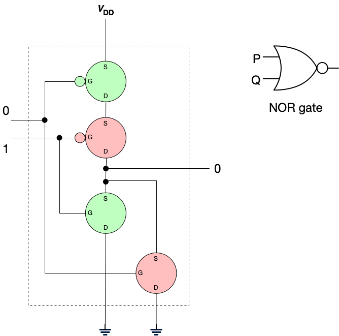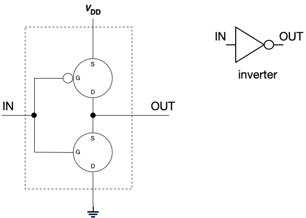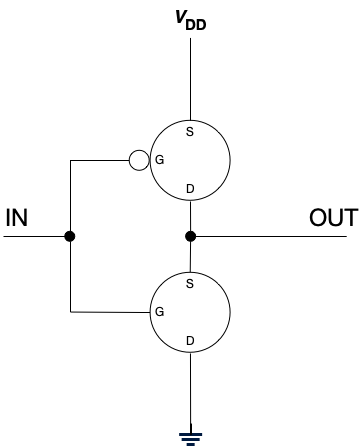 (For the astute reader: Yes, you can construct an inverter from a single PMOS transistor. However, we construct inverters using this two transistor design because this design reduces power consumption, produces strongly differentiated outputs, can switch more quickly, and is more robust to noise.)