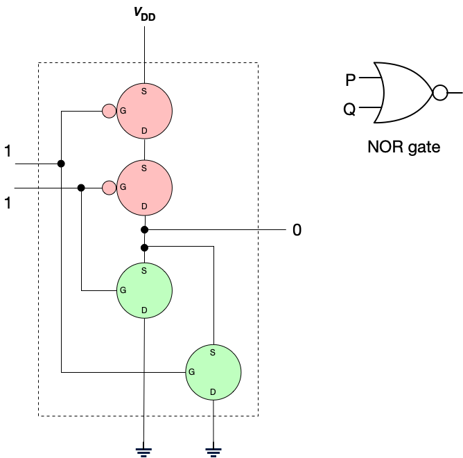The NOR gate is often called a “universal gate” because it can (in principle) be used as a component to construct gates to perform any other logical operation.