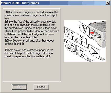 | 1 | In the printer driver choose the Advanced tab, click the Duplex icon, then choose the Manual Duplex printing mode, and then from the Basic tab choose the Paper Source to be Manual feed. |