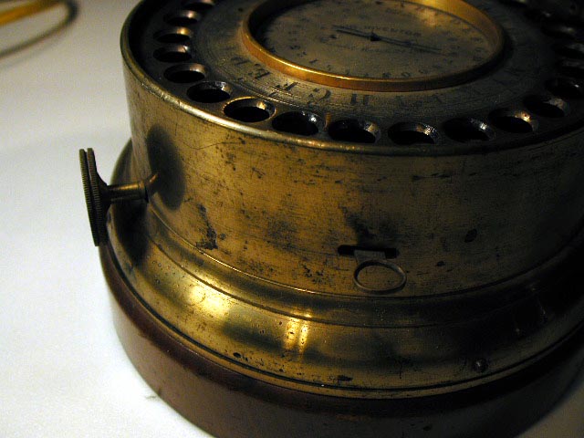 This dial telegraph is 71/2" in diameter at the base, and 4" high. Invented by Alexander Bain, the Vermont and Boston Telegraph Company used Bain's equipment over Morse's from its begining in 1848 until it was aquired by Western Union in 1866. It is not known if the Vermont and Boston line used dial telegraphs of this type. This line was probably the last Bain line in sevice and somewhat unique in that it did not parallel a Morse line. A University of Vermont Professor, George Wyllys Benedict, would later work for the Vermont and Boston as an engineer and would develop and patent his own insulator. For a general description of how a dial telegraph works click here. |