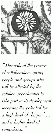 | While the catalysts driving a collaborative effort may be varied — a crisis, funding, interests, leadership, etc. — gaining participation from a wide range of individuals and groups is critical. Collaborative efforts that have successfully woven themselves into the fabric of the community are those that include a broad cross-section of people and organizations. This does not just happen; rather, it must be carefully planned as a core element of the collaborative effort. |