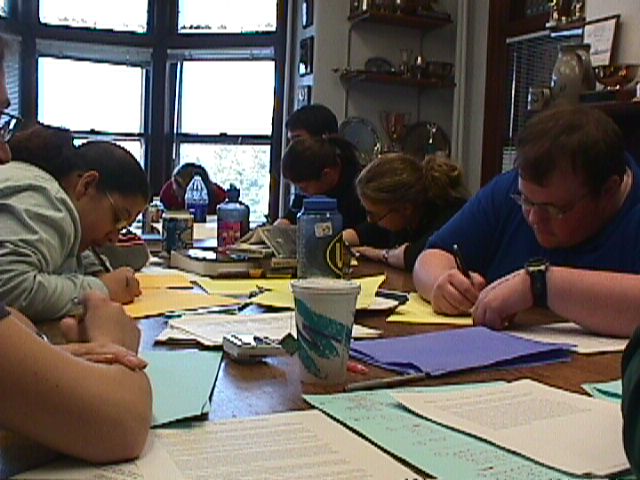 The day begins at 8 AM as eight teams are involved in four practice debates. The action is fast and furious. By 8:30 all four debates are intensely taking place in four different parts of the debate office. After the debates, a critique and a short business meeting students do research, prepare arguments, organize their files and share evidence and arguments with each other. After a brief lunch students are back in the offices continuing the morning activities. At 2 PM the debaters assemble for 30 minutes of speaking drills. At 2:30 PM negative argument drills begin. Students choose one of their major negative positions and are given a list of affirmative responses prepared by the coaches. They prepare to extend their position answering those arguments, and then give a 4-6 minute speech to a coach. After receiving criticism and suggestions the students make changes and give their speeches again. Some days at 4 PM there is a training session for the younger debaters. At 5 PM the day official ends, except that many students stay later or return to the offices after dinner for more work.