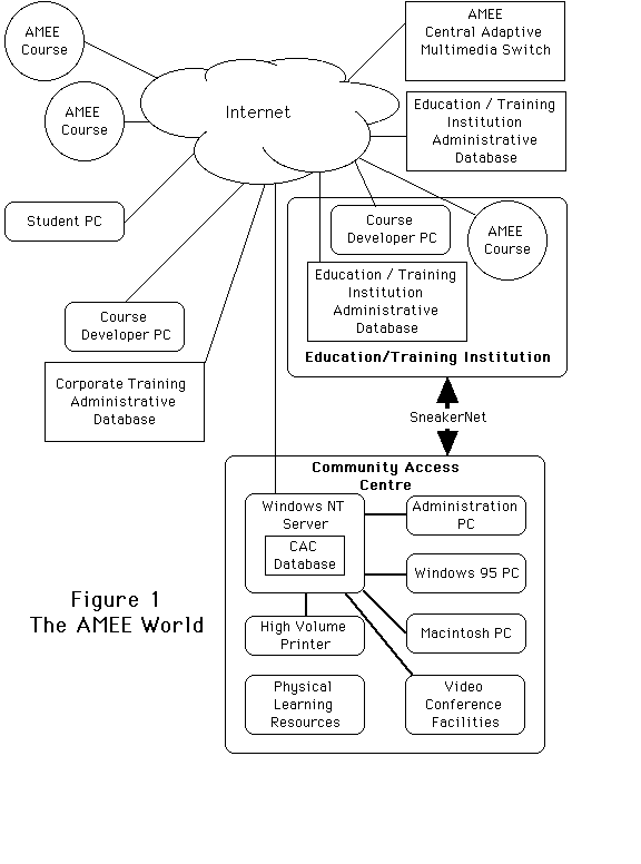 Figure 1 provides a pictorial overview of the AMEE World. AMEE utilizes the Internet for electronic transfer of materials and SneakerNet (or some commercial carrier of physical goods (e.g., Canada Post) to deliver those materials that may not be in a digital form. The AMEE Central Adaptive Multimedia Switch (AMS) contains the database that provides links between courses, authors, educational institutions, corporate training centres, students and Community Access Centres (CAC). Thus a student can register at a CAC, browse courses from a number of institutions, enroll in a course, schedule resources (e.g., a multimedia personal computer, a video clip which requires gigabytes of storage, a large print job) and study. Equally, if the material the student is learning does not need the resources available at the CAC, the student could continue the course using their personal computer at home.