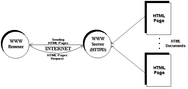 Fig. 2 represents the standard structure used in the WWW. It uses the client-server paradigm. Every time a user connects with an URL through Internet, the browser (client) sends a message to a process in th e server, called HTTPD (HTTP Daemon). This process will look for the document requested by the user, in the set of HTML documents existent in the server. When the page is found it is sent to the client. In this structure the documents are files of the fil e system of the server. Due to the characteristics of the connectionless of the protocol that communicates the client and the server (HTTP-HyperText Transfer Protocol) the connection is lost when the WWW server sends the documents to the client. The conce pt of free navigation appears here because the server doesn't control the sequences of pages that must be sent to the client, and he selects the documents that he wants. That's why it is difficult to control the actions of the user or to get a g uided navigation because each communication between the client and the server is independent of the others.The system we have developed can't use that structure for two fundamental reasons. The first one is that it's needed to hold information about each user (user profiles) to make a curriculum to keep his actions, to allow the multisession, keep th e actual state of the user, generate the next level for the user, etc. The second reason is that the documents that are shown can't be static and must be personalised including state information; for example, the number of lives, the actual level, and som e dynamic information needed by the server, as the user identifier. The solution chosen is to use HTML templates, which have a general scheme of information necessary for each kind of document.