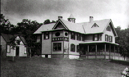 This very large, Queen Anne style, two-and-a-half-story, irregular bay, gable roof house with east side entrance and Colonial Revival style wrap-around porch has a complex plan that reflects continuous additions from 1885 to 1914. The house has a coursed rough ashlar foundation, clapboard siding, and a slate shingled roof with exposed rafter tails and modest decorative brackets that hold up the wide gable end trim. Originally a four-room cottage called The Wigwam,