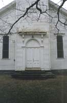 On the plane of the front facade are the two rectangular flanking windows, which are stained glass with sliding sash in three sections with diamond shape panes, or quarrels. The profile of the window is long and thin, with a flattened arch at the top. Above the window is another flat hood supported by the two Italianate brackets. The corners of the main mass of the church have quoins rising from the foundation. A wooden ìstring- courseî surrounds the building above the quoins, separating the pilasters with Doric capitals above from the string course below.