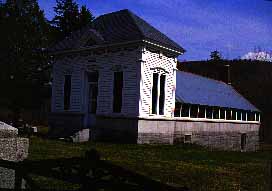 The conservatory, which lies just inside the cemetery grounds southeast of the mausoleum, was completed in 1882. The building consists of two parts: a rectangular vestibule and the greenhouse extending back from it. The basement of both sections is dark colored, random coursed granite ashlar. Above this is a layer of lighter colored granite blocks topped by a water table of the same stone. The vestibule is clad in white clapboards with corner pilasters. It has three bays across the front and one on each side. The front bays are symmetrically arranged with the door in the center. A hipped roof with asphalt shingles rises above the vestibule. A small pediment with a sunburst design is symmetrically placed on the front slope of the roof. Below the eaves is a wood frieze containing triglyphs and metopes. The metopes contain festoons of laurel leaves. Each bay has a peaked lintelboard containing a sunburst design. The front windows are doublehung sash; the side windows are paired doublehung sash. All windows in this section are Queen Anne type. The front windows have small panes alternating a variety of colors on the outside edges of the sash. The side windows have two small, colored panes at the top of the top sash and the bottom of the bottom sash. The wooden door contains two windows, one above the other, and is topped by a transom window. The main top pane is green, and the main bottom pane is blue. Smaller panes in a variety of colors line the outside edges of these windows. The transom is also lined with small, colored panes around its outside edges.