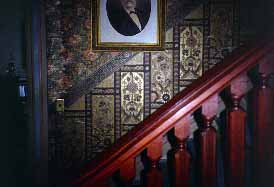 The interior of the house is focused around a large central hallway serving as the main avenue of traffic and entrance area to the adjacent rooms. The hallway flows into a large, wide staircase that provides the main means of egress from the entertainment area of the house to the private rooms on the second floor. Four formal rooms with sixteen foot ceilings, pocket doors, fireplaces and tall windows form the main block of the building. On the first floor, the hallway and front parlor still retain the original wallpaper from 1882 with classic Anglo-Japanese asymmetrical designs and exotic motifs. The other rooms have been redecorated to approximate the original wallpaper and paint colors.