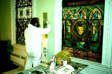 UVM Historic Preservation Program graduate student, Will Bentley, removing paint layers to document the historic decorative finish designs in John Dewey Lounge. 1991.