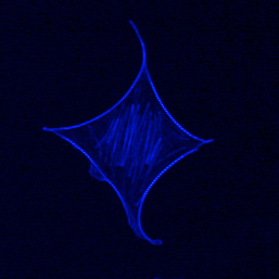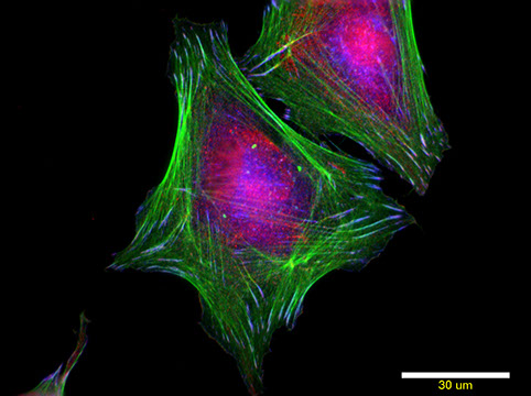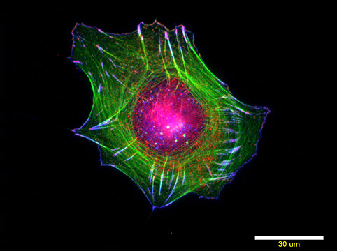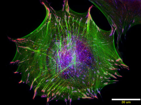 F-actin (green) and focal adhesions (red, blue) in a human dermal fibroblast