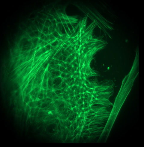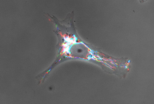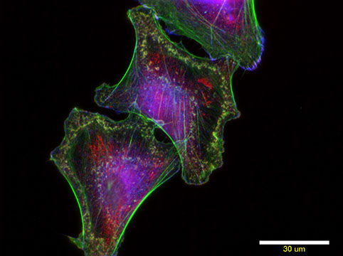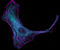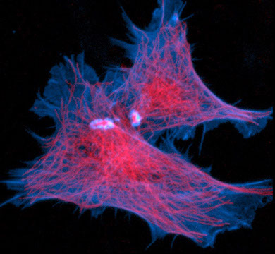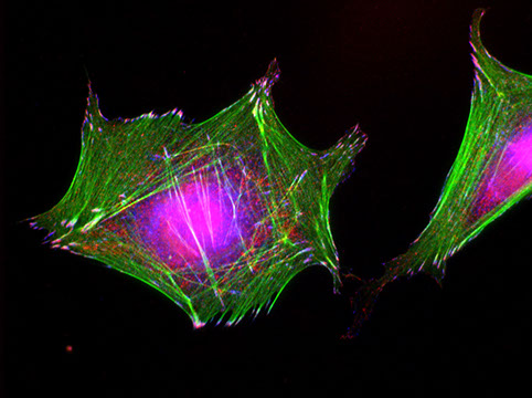 Human dermal fibroblasts (green=actin; red=VASP; blue=vinculin)