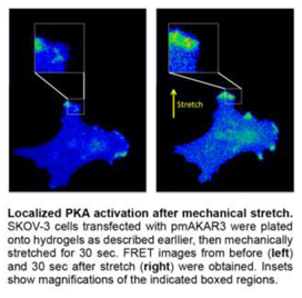Rapid, localized activation of PKA (visualized with a FRET biosensor) in response to cellular stretch