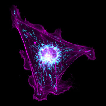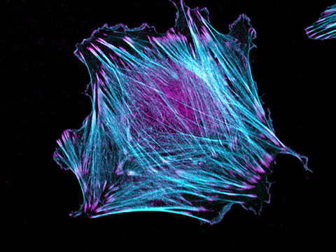 A human fibroblast stained to visualize the actin cytoskeleton (magenta) and mitochondria (cyan)