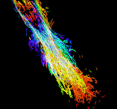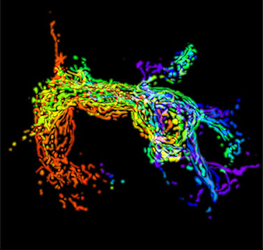 A color-coded time lapse of mitochondrial trafficking in an SKOV3ip cell invading a 3D matrix (see Cunniff & McKenzie et al, MBoC, 2016; PMID 27385336)