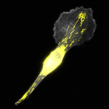 A migrating mouse melanoma cell stained to visualize the actin cytoskeleton (grey) and mitochondria (yellow)
