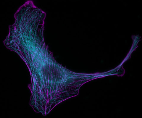 B16F10 mouse melanoma cell stained to visualize F-actin (cyan) & microtubules (magenta)