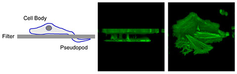 Purification of chemotactic pseudopodia - Schematic (left) and actual cell (middle & right)