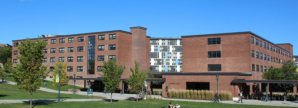 While Mason-Simpson-Hamilton Halls were initially conceived as the key to bringing women at the University of Vermont together on the Redstone Campus this stated goal was upended within eleven years of the dormitory complex’s completion. In 1968 the university’s trustees decided to end gender-based segregation in the dormitories and over the following years the Redstone Campus’s dormitories were integrated by gender.12 After the dormitories were integrated, Mason-Simpson-Hamilton Halls retained its form for the next two decades. A renovation campaign took place in 1987 during which the university spent $3,000,000 renovate the bedrooms, install new bathrooms, new roofs, interior fixtures, and double-hung windows.13 Another repair campaign commenced in 2011; similar to the repairs in 1987 the university requested contractors provide bids for exterior repairs to the building envelopes, and interior renovations, though these were limited to Simpson Hall.14 Since the completion of these renovations Mason-Simpson-Hamilton Halls seen little change. The dormitories form a rough quadrilateral with two other residential complexes at the Redstone Campus, Christie-Wright-Patterson Halls, and Wing-Davis-Wilks Halls. The green space these dormitories center on is a center of student activity and each year thousands of students pass the time sitting in the shadow of Mason-Simpson-Hamilton Halls.