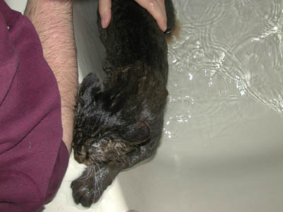 | They slathered me with some kind of apple-smelling slime, which made me even more slippery. One paw up on the tub, and I almost escaped! Alas, they had me outnumbered and it was back in the tub with me. My body started to foam and that apple smell filled the air. I tried to run, but my feet kept slipping! They poured buckets of water over my head and rubbed me all over. Then they lifted me up and put my whole body under running warm water! Finally, the apple foam disappeared and I was merely miserable again. They even ran water over my tummy. It took a while to get all of the slime off. These people definitely bathe the hard way. |