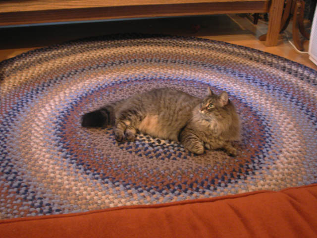 We bring a beautiful hand-woven wool rug home, made by Mike's Aunt Ellen. Within minutes, Shadow has taken up residence (Fiona later stopped by for a snooze, but she slinked off before I could snap a picture). Now, if we could only keep them from coughing up hairballs on it.. so far so good.