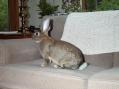 Zomo is a funny bunny. These pictures were taken on May 17, 2000. As you can see, her adult fur has come in all over, with the exception of a little rectangle on her forehead. Her ears were always up, but lately, her right ear seems to prefer a semi-lop position. I think she's adorable. Zomo's mom, Cadbury, was recently adopted, and her dad, Elliot, is in foster care, and eligible for adoption.