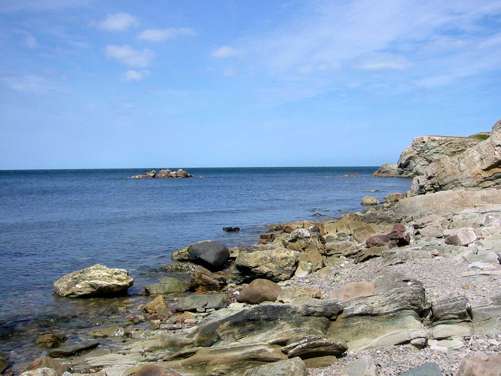 Until you bottom out in little bays like the one shown <---- here. Then heading south you travel by out-croppings like these-- I think they are gypsum here ------> |