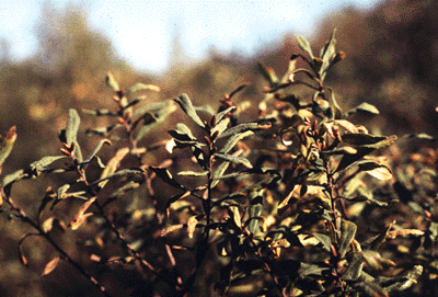 A shrub found along stream bottoms and swamps in the northeastern U.S. that is capable of nitrogen fixation. Leaves are about 2" and toothed toward apex with resin dots on lower or both surfaces. Twigs are hairless, rusty, purplish or brownish with small whitish oval buds with preformed male catkins. Fruit comes in clusters of small drupes which are not wax-covered and ripen in July.