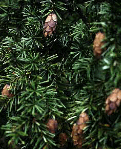 A relatively rare tree restricted to upper slopes of the southern Appalachians. Needles are similar to T. canadensis, but slightly larger (3/4"), and not 2-ranked. Cones are about 1-1/2" long and ovoid with scales open at right angles to the central axis.