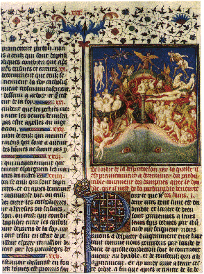 Creation and Fall of the Angels. ca. 1410. Illumination,18 x 11 3/4 in. Historiated Bible of Guiard des Moulins. Department of Manuscripts, Royal Library of Belgium, MS 9001, f. 19. L.M.J. DeLaisse. Medieval Miniatures. London: Thames and Hudson, 1965. Plate 21