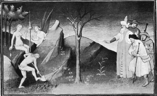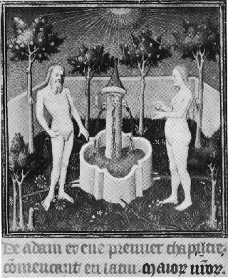 Adam and Eve.15th C. Illumination.Paris, Bibl. de l'Arsenal, ms. 5193, f. 8v. Meiss, Millard. French Painting in the Time of Jean de Berry: The Boucicaut Master. London: Phaidon, 1968. Pl. 381