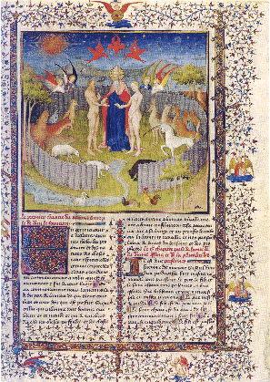 Boucicault Workshop.Scenes of creation.15th C. Illumination. Paris. Bibl. Nat., fr. 9141, f. 9. Meiss, Millard. French Painting in the Time of Jean de Berry: The Boucicaut Master. London: Phaidon, 1968. Pl. 447